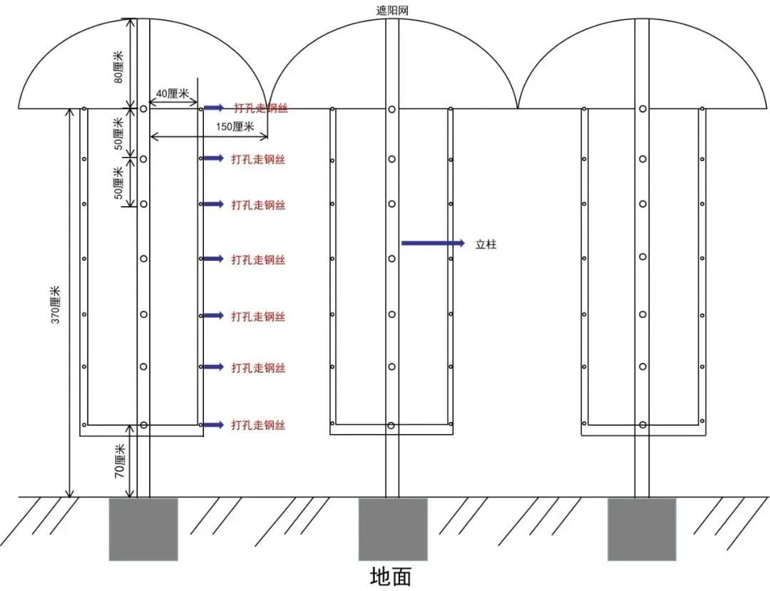 在立柱上横梁两侧各1.5m处(两行正中间位置横梁上)及立柱顶端纵向矩管上,连接或焊接弓形圆管(6分管)、弓形塑钢条(实心)或屋脊状镀锌钢丝(8号),以支撑遮阳网。弓管、钢条或钢丝间隔分别为2.0、1.5、1.0~1.5m。